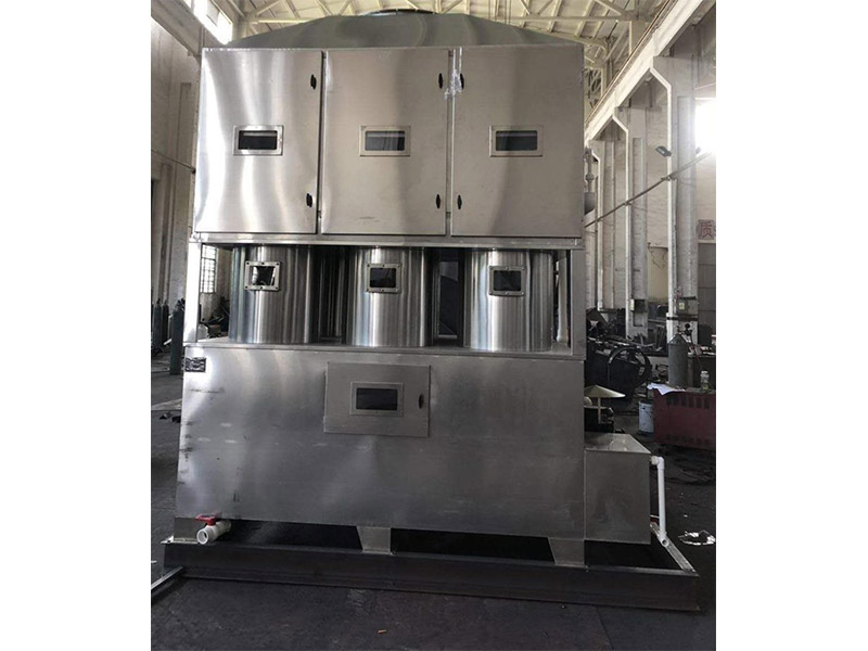 方型旋流塔預(yù)處理設(shè)備過(guò)螺旋噴頭,形成細(xì)小堿水霧氣,與瀝青煙氣相碰撞,通過(guò)高速運(yùn)轉(zhuǎn)的填料球加大液滴合并,產(chǎn)生沉降。